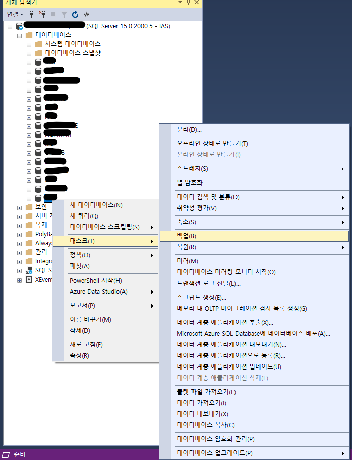 먼저 데이터베이스 접속 후 백업을 하고자 하는 DB -> 테스크 -> 백업으로 이동합니다.